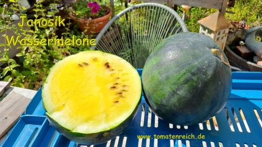 Janosik ist eine gelbfleischige Wassermelone aus Polen mit dunkelgrüner Schale.